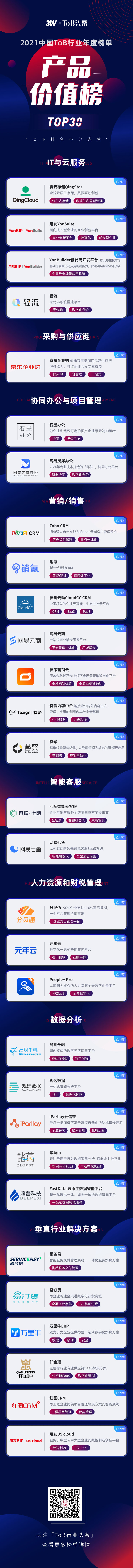 此次評(píng)選共歷時(shí)2個(gè)月,由「ToB行業(yè)頭條」聯(lián)手3W集團(tuán)、50+投資機(jī)構(gòu)及行業(yè)專家,從產(chǎn)品質(zhì)量、技術(shù)應(yīng)用、研發(fā)投入、用戶規(guī)模和產(chǎn)品復(fù)購率等多個(gè)維度對(duì)參評(píng)產(chǎn)品進(jìn)行綜合評(píng)判,最終從報(bào)名及推薦參選的100多家產(chǎn)品中挑選出了最具市場價(jià)值的ToB產(chǎn)品TOP30。