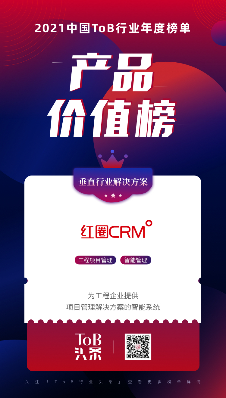 2022年1月4日,「ToB行業(yè)頭條」聯(lián)手3W集團(tuán)正式發(fā)布了《2021ToB行業(yè)年度榜單·產(chǎn)品價(jià)值榜》,紅圈CRM工程項(xiàng)目管理系統(tǒng)榮登最具市場價(jià)值的ToB產(chǎn)品TOP30榜單!