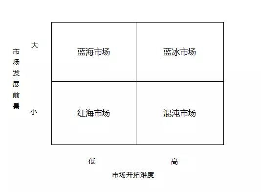 我們可以從市場開拓難度和市場發(fā)展前景兩個(gè)維度分析不同類型的市場。混沌市場的發(fā)展路徑不連續(xù),開拓難度高,未來方向不確定,發(fā)展前景小;紅海市場已經(jīng)相當(dāng)成熟,開拓難度最低,市場競爭激烈,發(fā)展前景小;藍(lán)海市場相對(duì)藍(lán)冰市場而言,開發(fā)難度較低,藍(lán)海市場和藍(lán)冰市場同樣市場前景較大。