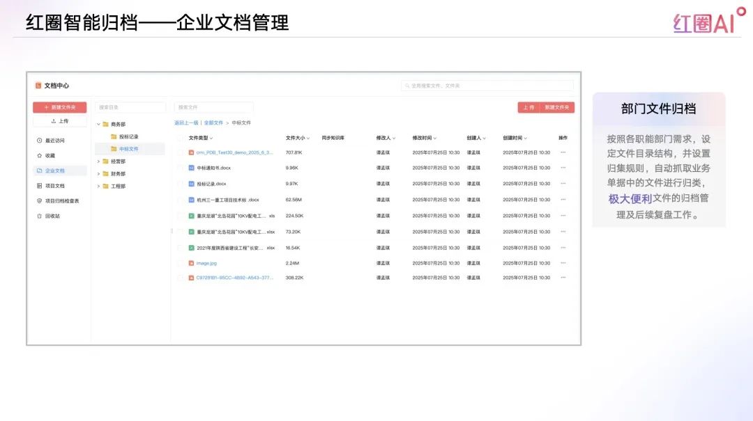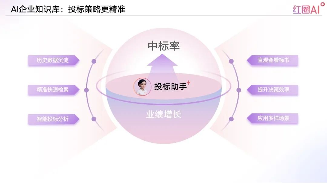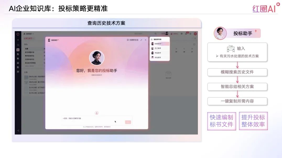 以往投標(biāo)流程中,資料查找和內(nèi)容比對(duì)耗時(shí)耗力、風(fēng)險(xiǎn)頻發(fā)。紅圈AI通過快速檢索歷史標(biāo)書、技術(shù)方案、成功案例等內(nèi)容,助力企業(yè)建立專屬“投標(biāo)智庫”,讓策略制定更具數(shù)據(jù)支撐。