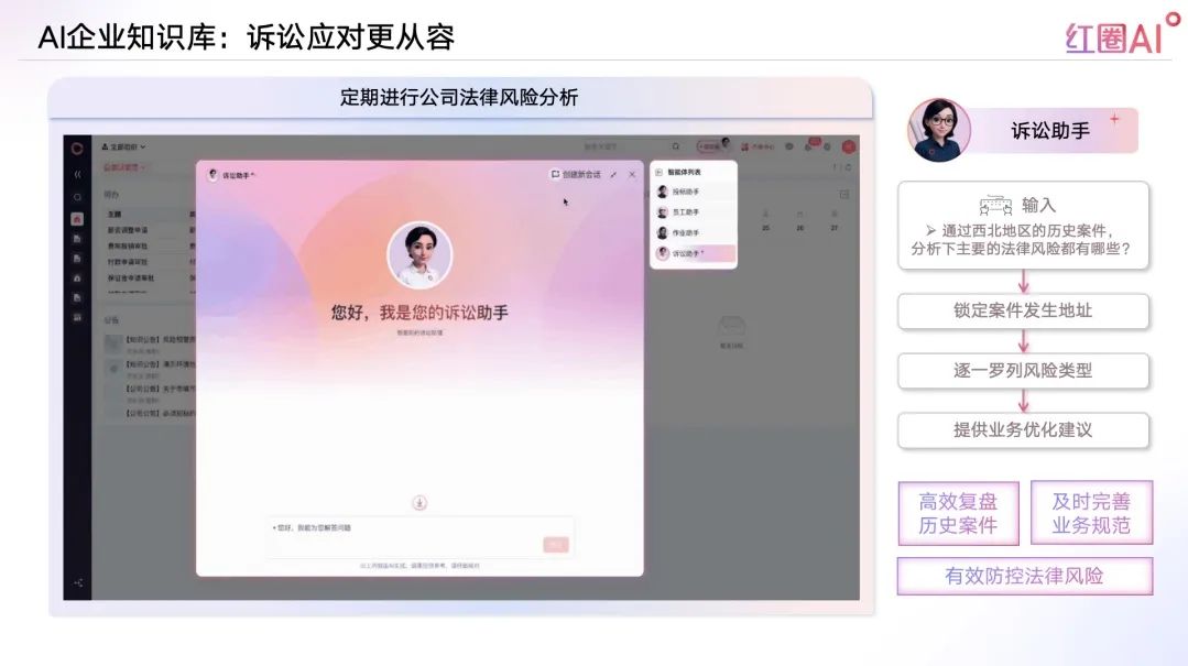 AI定期進(jìn)行公司法律風(fēng)險(xiǎn)分析,訴訟助手高效復(fù)盤歷史案件,及時(shí)完善業(yè)務(wù)規(guī)范,有效防控法律風(fēng)險(xiǎn)。