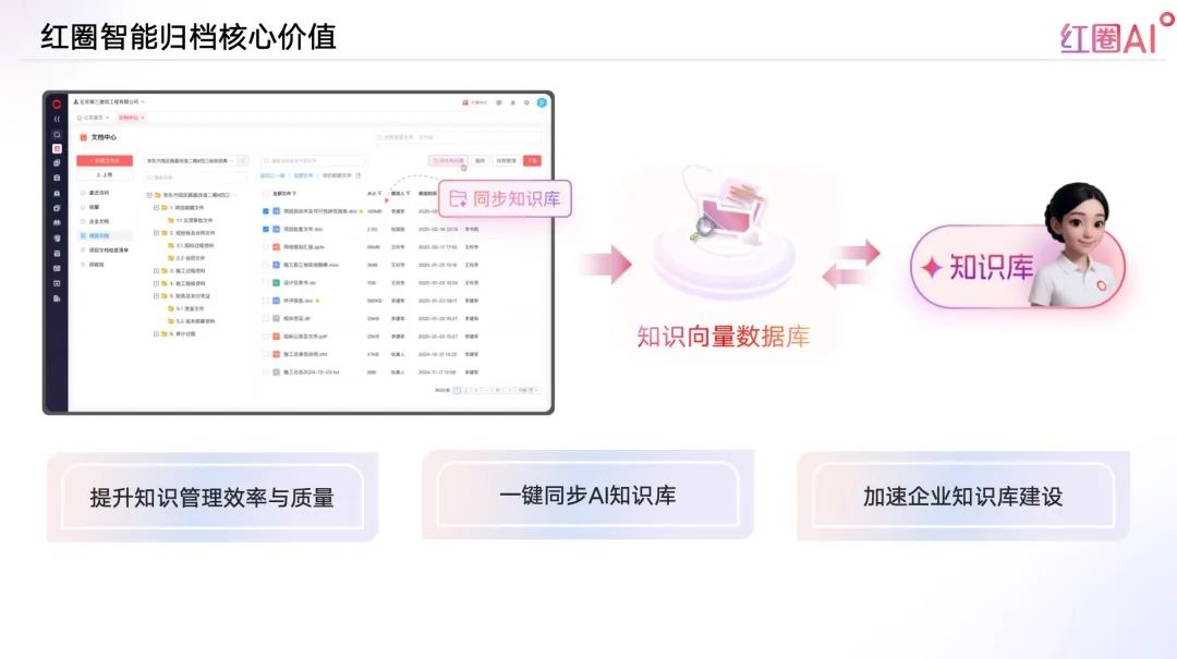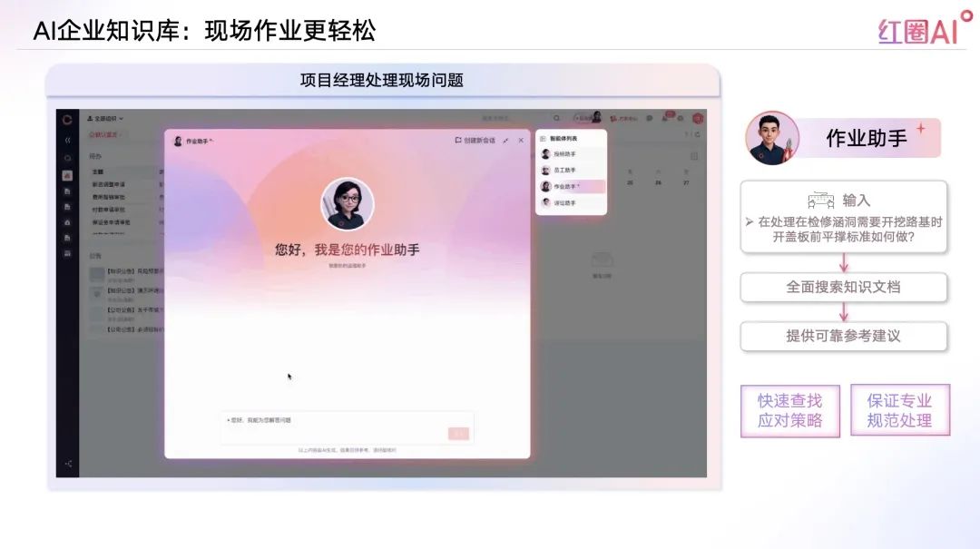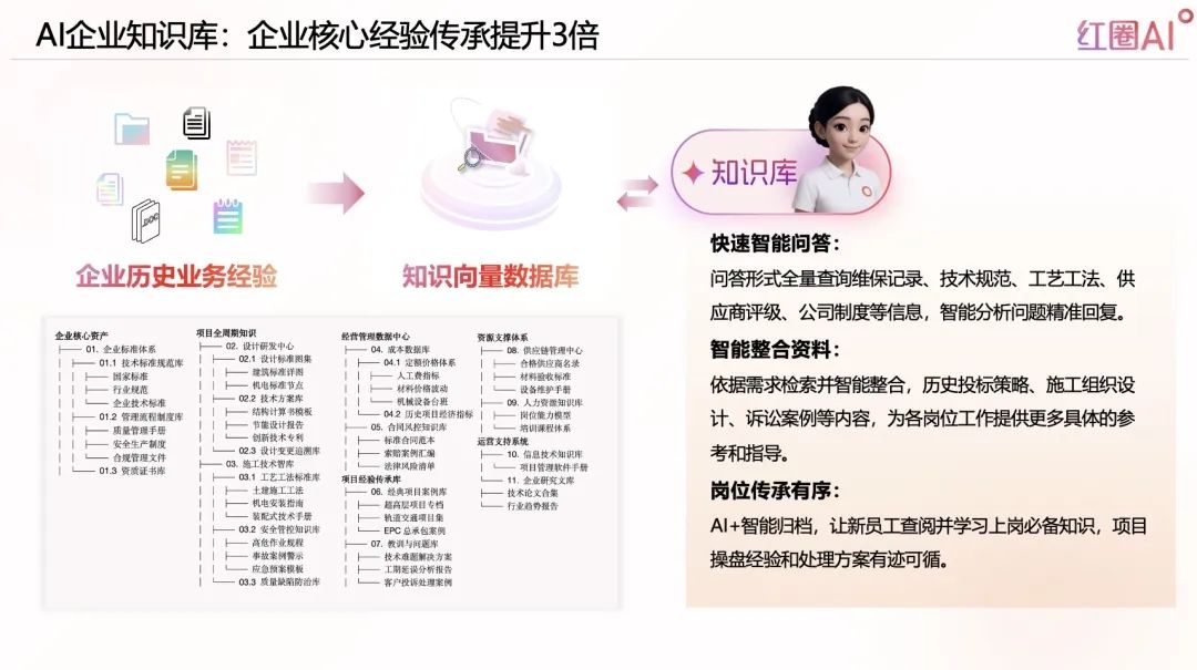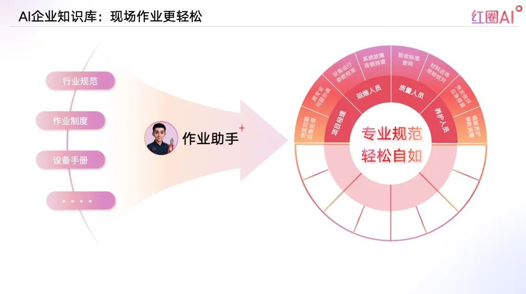 紅圈AI,以大模型+智能檢索技術(shù)為引擎,構(gòu)建企業(yè)知識(shí)資產(chǎn)體系,實(shí)現(xiàn)“經(jīng)驗(yàn)即問即答”,推動(dòng)企業(yè)從“人找知識(shí)”走向“知識(shí)找人”。