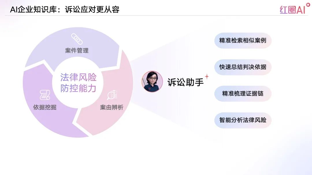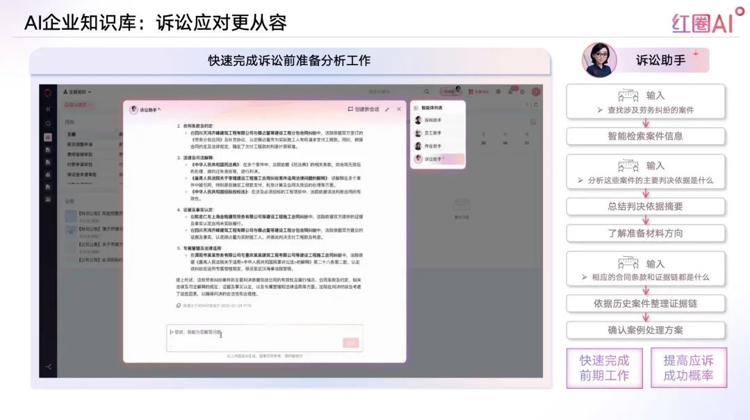面對(duì)工程糾紛突發(fā)性強(qiáng)、資料復(fù)雜的挑戰(zhàn),紅圈AI構(gòu)建訴訟智庫,協(xié)助法務(wù)快速調(diào)閱判例、合同、律師函、內(nèi)部分析等核心資料,高效支撐應(yīng)訴與風(fēng)險(xiǎn)防控。