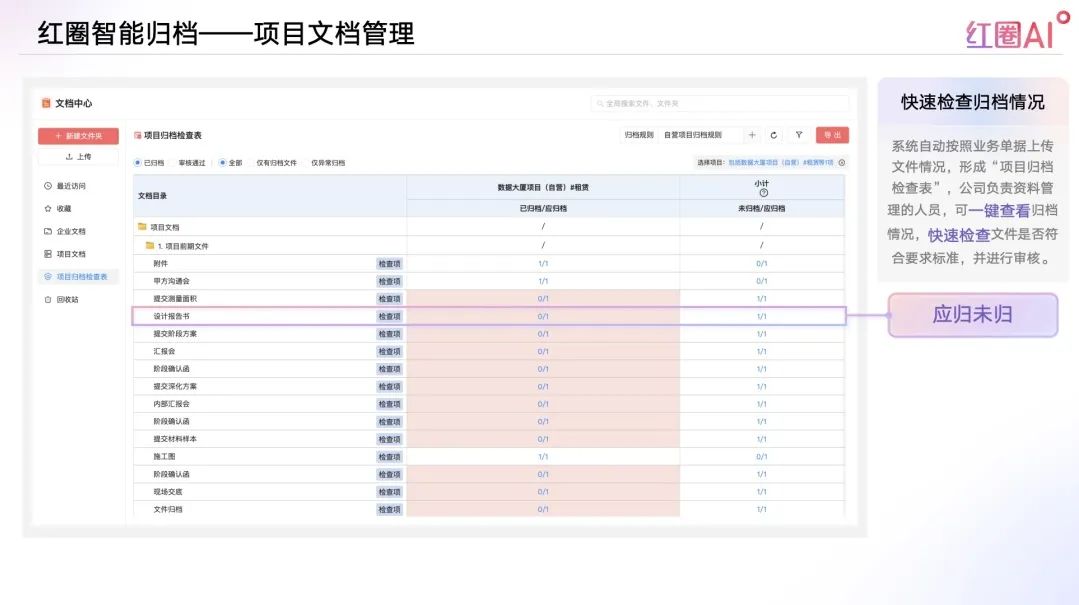 系統(tǒng)自動(dòng)按照業(yè)務(wù)單據(jù)上傳文件情況,形成“項(xiàng)目歸檔檢查表”,公司負(fù)責(zé)資料管理的人員,可一鍵查看歸檔情況,包括“應(yīng)歸未歸”、“應(yīng)歸已歸”、“已歸未審核通過”等。