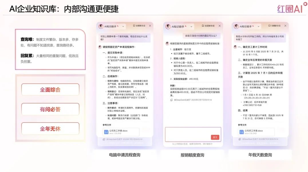 員工常見問題如流程、制度、額度等,在傳統(tǒng)體系下查詢不便、響應(yīng)緩慢。紅圈AI通過自然語言對(duì)話,打造全天候問答系統(tǒng),全面提升辦公效率。