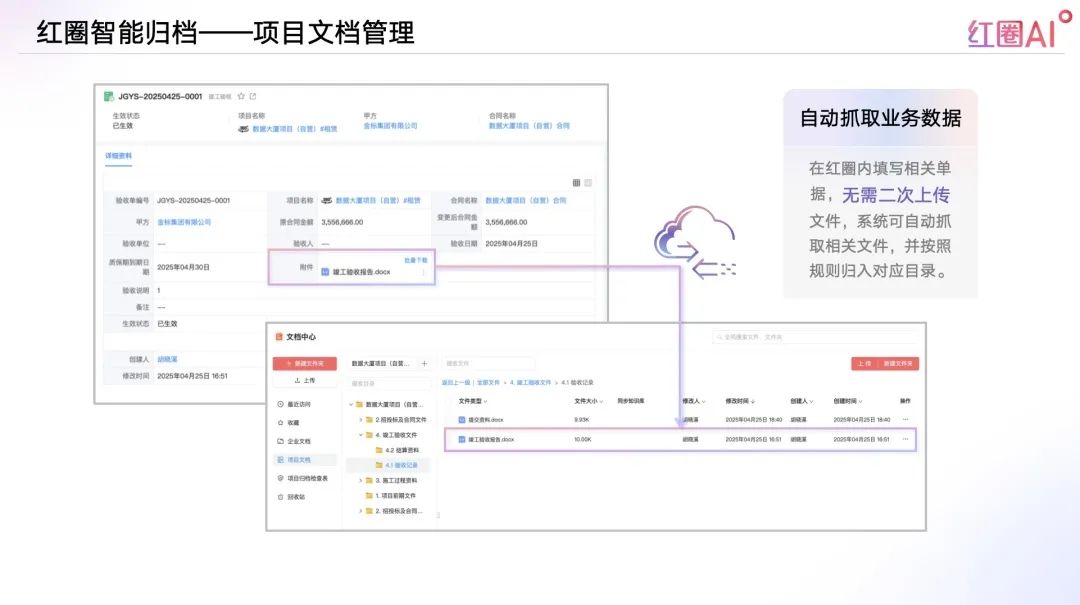 在紅圈內(nèi)填寫相關(guān)單據(jù),無需二次上傳文件,系統(tǒng)可自動(dòng)抓取相關(guān)文件,并按照規(guī)則歸入對(duì)應(yīng)目錄;