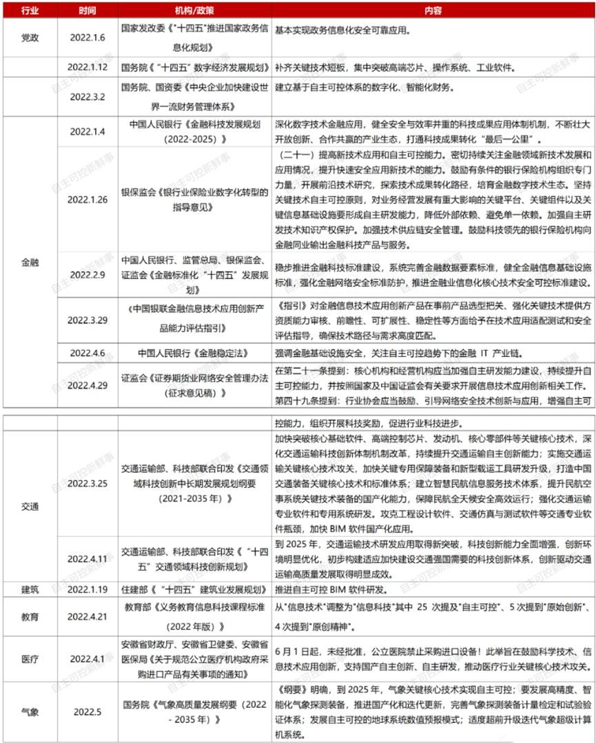 據不完全統計,截至2022年6月13日,國家頂層設計層面共出臺信創相關政策14份。分行業來看,金融6份、交通2份、建筑1份、教育1份、醫療1份(安徽省)、氣象1份。