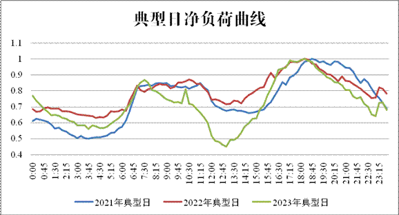 由于湖南光伏發電裝機的快速增長,湖南電網凈負荷曲線(電網凈負荷=電網負荷-新能源出力-外受電)產生向“鴨子型曲線”轉變的趨勢(見圖),午間腰荷時段凈負荷越來越低,該時段可再生能源消納困難情況開始顯現。以2023年某日為例,該日光伏發電出力較大,腰荷時段電網凈負荷較前兩年同期明顯下降,同時低于當日低谷時段凈負荷,導致腰荷時段新能源消納更為困難。