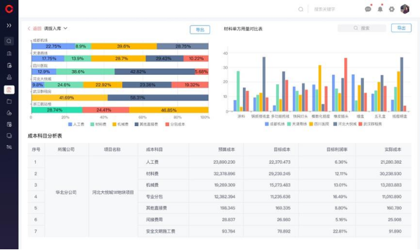 跨項目成本分析:通過統(tǒng)一數(shù)據口徑,橫向對比不同項目的同一成本科目(如混凝土用量),快速發(fā)現(xiàn)異常波動,擠壓“成本水分”。